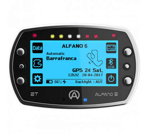 Alfano 6 2T Características: Alfano 6 2T está equipado com 3 sistemas GPS (únicos no sector): Sistema GPS americano - Sistema Glonass russo - Sistema Galileo europeu, para uma precisão de tempos de volta, velocidade e trajectória nunca antes alcançada. Base de dados com 2.527 circuitos em memória. Com a sua tela de 268 x 128 pixels, você pode monitorar toda a informação de uma forma legível. O visor tem retroiluminação com 3 níveis de brilho ajustáveis, um sensor de luz ambiente e 6 cores diferentes. Para facilitar a legibilidade dos dados adquiridos, tais como tempos de volta e parciais, temperaturas, velocidade, número de corridas, você pode escolher até 5 telas de corrida (1 por padrão e 4 para personalizar como desejar). Alfano 6 2T está equipado com 6 LEDs configuráveis individualmente, com a possibilidade de escolher a cor e os valores de activação. Você pode optar por ativar os LEDs para mudança de velocidade, alarme de temperatura ou melhor tempo/intermediário. Além disso, com os 2 LEDs configuráveis individualmente, você pode definir um valor de ativação para água, piso ou dreno. Alfano 6 2T está equipado com Bluetooth para download de dados ou actualização de firmware com o nosso APP ou PC. Alfano 6 2T é capaz de indicar a engrenagem introduzida através do sensor de velocidade. Alfano 6 2T está equipado com uma bateria integrada de lítio recarregável de longa duração Compatível com os sensores Pro3 Evo.